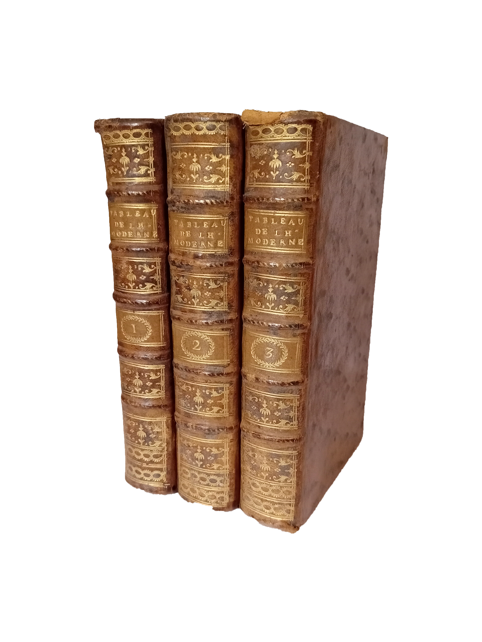 Plein-cuir, in-12, Dos à nerfs, Intérieur frais, coiffes frottées, des griffures sur les plats, 432 + 527 + 541 pages