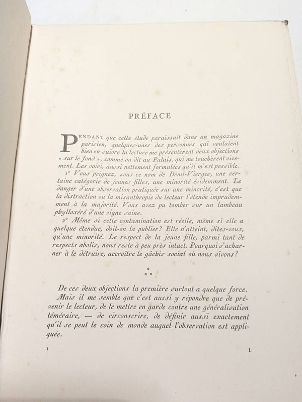 " A lire Les Demi-Vierges, on croirait que l'avenir et la stabilité de la société tiennent à la vertu de ses filles. Toutes ? Non, les seules jeunes personnes du monde oisif et élégant. Prévost n'en connaît pas d'autre. L'oisiveté lui semble être un élément essentiel de la qualité humaine et de l'emploi du temps des gens bien. L'oisiveté, c'est le cinq à sept, la possibilité pour les dames d'avoir leur " jour ", pour les messieurs de s'y rendre, et, pour les (presque) jeunes filles de passer un discret moment chez une amie complaisante qui leur laisse la libre disposition d'une chambre. Une chambre ! Ah, qu'y font-elles ? C'est la seule question que pose M. Prévost pendant quatre cents pages. Jusqu'où vont-elles ? Qu'acceptent-elles ? Il faut le reconnaître, il y a de quoi bouleverser les jeunes viveurs d'il y a un siècle. Qu'on imagine la poupée interdite qu'était alors une jeune fille, serrée dans un corset, enveloppée de jupons, une modestie voilant son décolleté, l'usage dégageant ses épaules - le soir, l'été - et laissant s'échauffer les rêves au-dessus de la gorge, de ce sillon, de cette félicité, de cette attente, de cette offrande. Oui, jusqu'où vont-elles ? La société de 1900 - à mi-chemin entre la Fête impériale et les audaces à la Paul Morand - avait élevé la traque des pucelages par les hommes et leur défense farouche par les filles à la dignité de ballet impudique, de parade ritualisée et acharnée. Là aussi, comme dans un duel, on s'arrêtait au premier sang ".