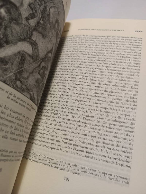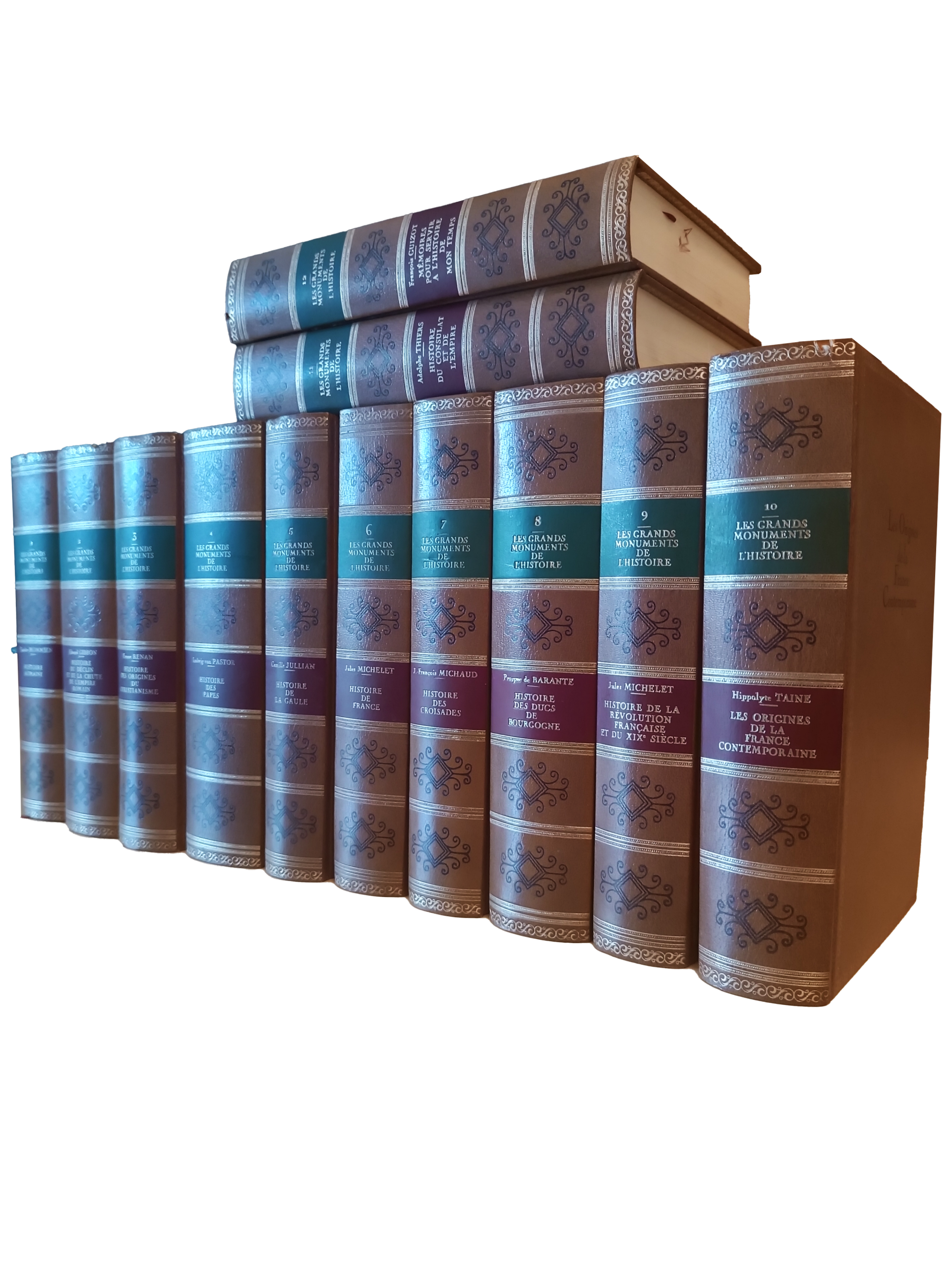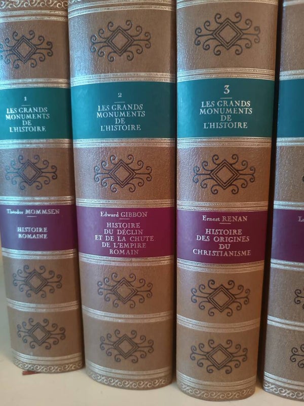 Ensemble de 12 volumes réédition abrégée de grands classiques de textes d'histoire majoritairement européenne couvrant la période de l'antiquité romaine au XIXe siècle. Tome 1 : Histoire romaine par Théodor Mommsen - Tome 2 : Histoire du déclin et de la chute de l'empire romain par Edward Gibbon - Tome 3 : Histoire des origines du christianisme - Tome 4 : Histoire des papes par Ludwig Von Pastor - Tome 5 : Histoire de la Gaule par Camille Jullian - Tome 6 : Histoire de France par Jules Michelet - Tome 7 : Histoire des croisades par François Michaud - Tome 8 : Histoire des Ducs de Bourgogne par Prosper de Barante - Tome 9 : Histoire de la révolution française et du XIXe siècle par Jules Michelet - Tome 10 : Les origines de la France contemporaine par Hippolyte Taine - Tome 11 : Histoire du consulat et de l'empire par Adolphe Thiers - Tome 12 : Mémoire pour servir à l'histoire de mon temps par François Guizot