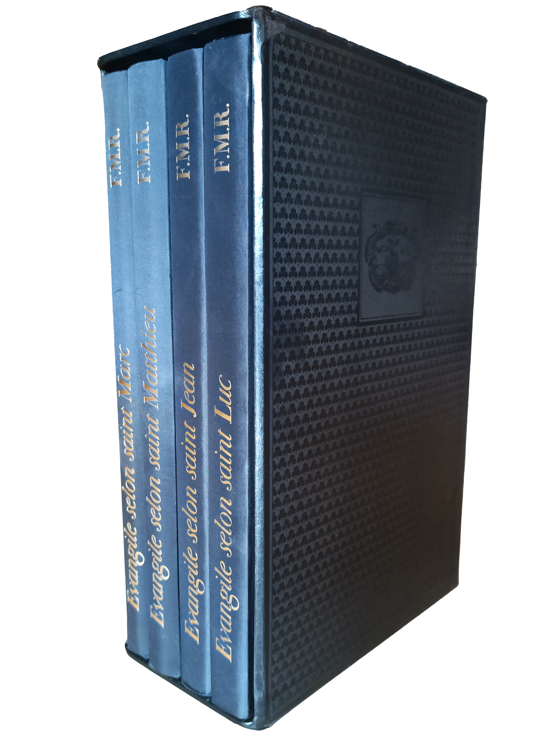 Texte latin dans l'édition critique d'Oxford établie par J. Wordsworth et H. White, Texte français dans la traduction de Port-Royal, avec les planches du Mömpelgarder Altar, 1530-1550, 4 vol. grand in-4 reliure éditeur pleine soie noire, sous étui commu,,